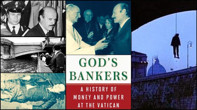 Those who have started GOD’S BANKERS are well aware that the grisly morning discovery, 34 years ago today, of an Italian banker hanging from London’s Blackfriars Bridge, is the start of the tale down the rabbit hole into the world of Vatican finances. Calvi was one of Italy’s top bankers, a friend of the Pope, and one of the Vatican Bank’s key business partners. He was also the mastermind of a byzantine offshore Ponzi-styled banking empire that finally collapsed, earning him a criminal fraud conviction and nearly bringing the Vatican Bank under.