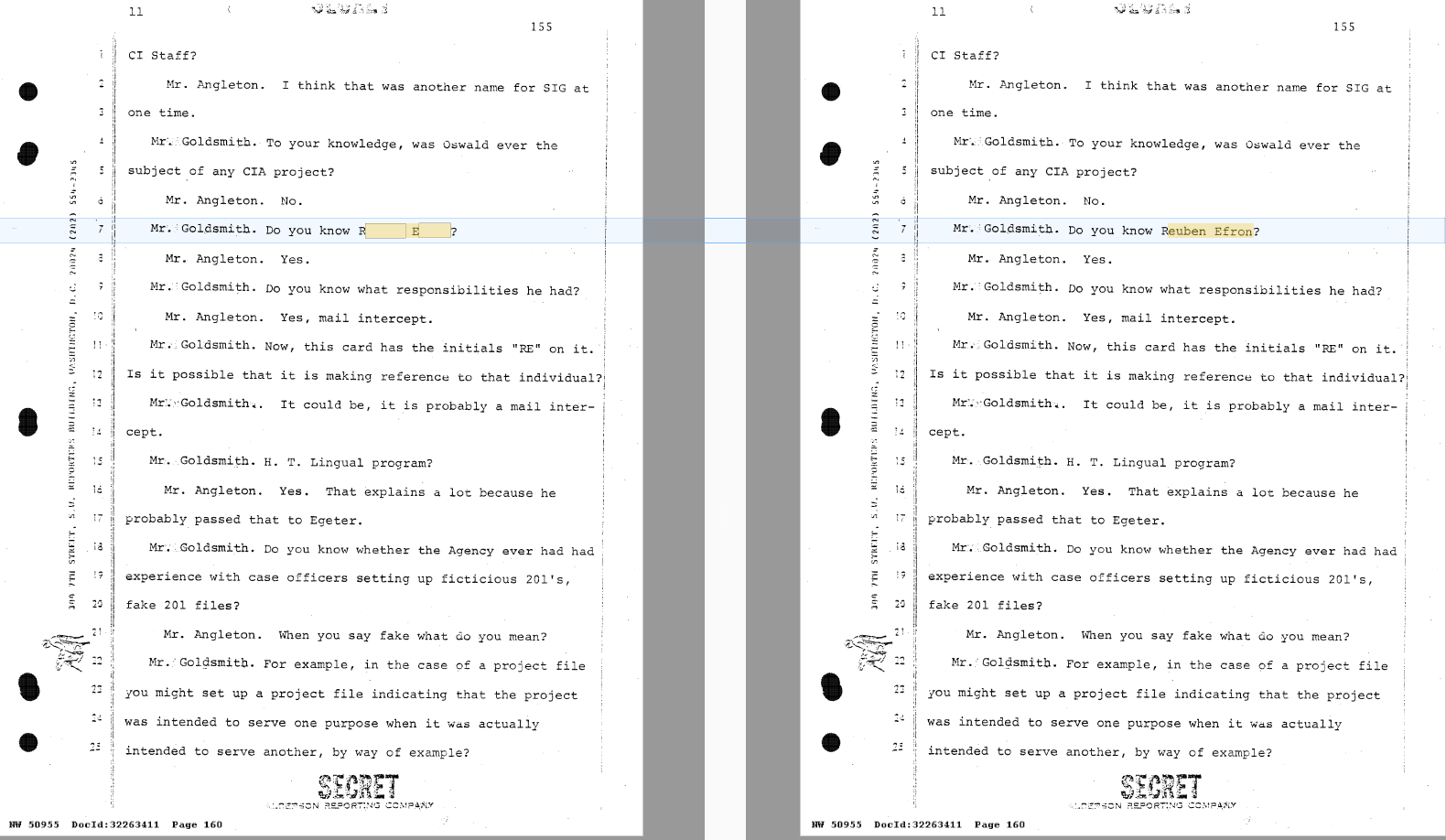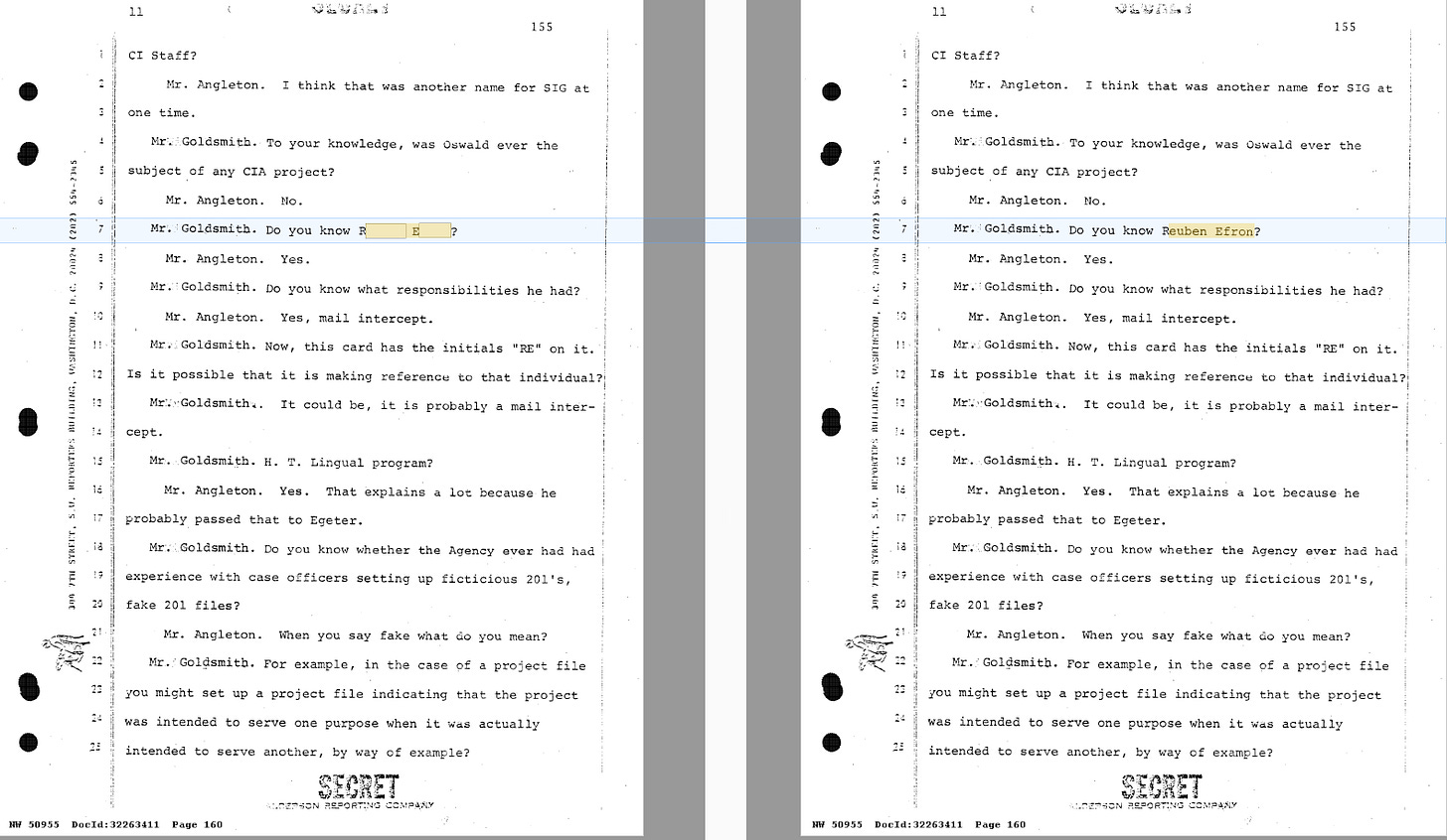 The HSCA also questioned James Jesus Angleton, the CIA’s Chief of Counterintelligence, in 1978. The latest Archives release includes his unredacted deposition. What the agency had fought to keep hidden was the name Reuben Efron, someone involved in reports about UFO’s possibly being spotted in Russia in the 1950s.