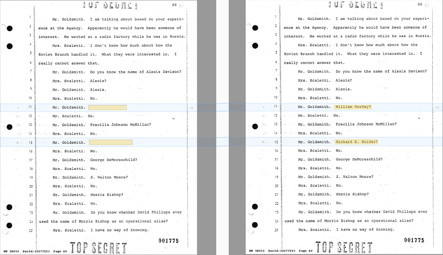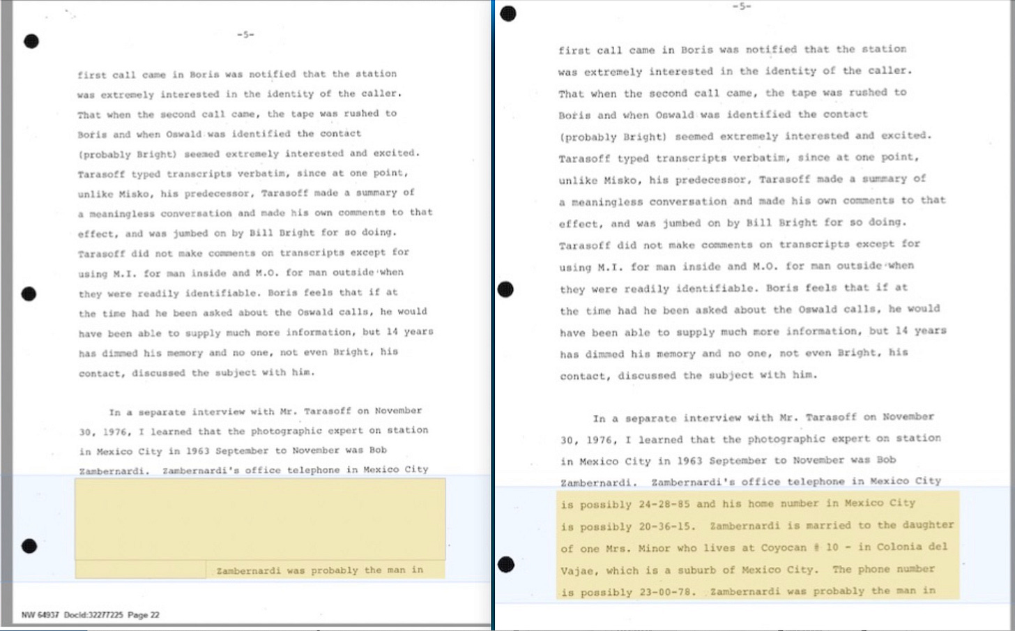 Another much anticipated document is the 1976 HSCA interview of Anna Tarasoff, a CIA translator who listened to some of the recordings the agency had of Oswald while he was in Mexico City. What had been kept sealed again had nothing to do with Oswald. It was instead the address and telephone number of James Zambernardi, the person who ran the CIA's photographic observation post outside the Cuban Consulate in Mexico City in 1963. Also redacted was the name and address of Zambernardi’s wife.