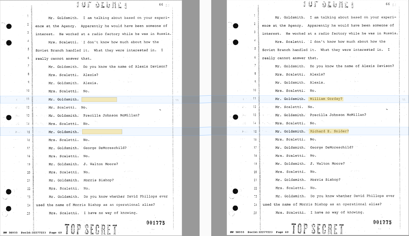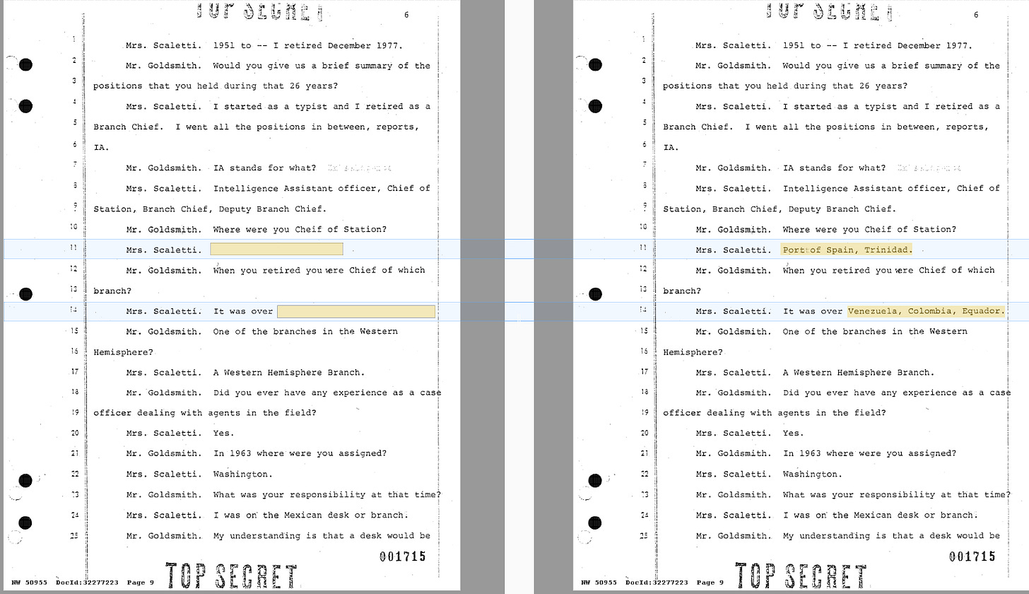 Another long-awaited release was the deposition of Charlotte Bustos (questioned under her alias, Elsie Scaletti). She worked on the CIA’s Mexico Desk. What had been secret until May 11 was the location where she had been Chief of Station (Port of Prince, Trinidad) and the countries she oversaw (Venezuela, Colombia, and Ecuador). Also, two names appear to be revealed in the questions asked of Scaletti, however they were unredacted in previous document releases.2