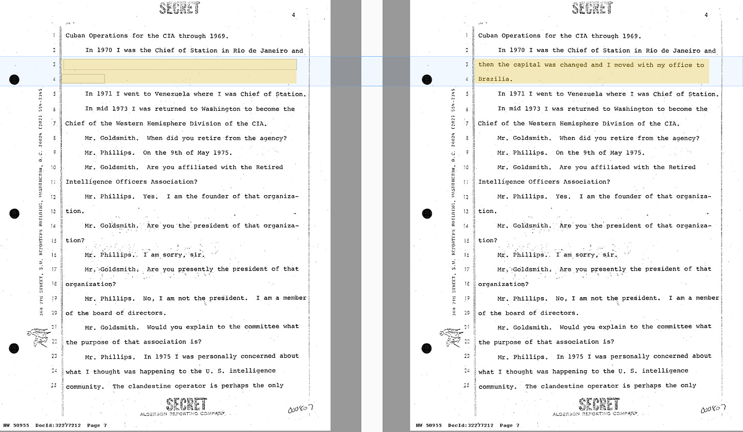 It answers what was blacked out in one section. Again, the CIA fight for secrecy was not related to Oswald or the JFK assassination, but instead was about the CIA’s 1970 decision to move its Brazil Station from Rio De Janeiro to Brasília.