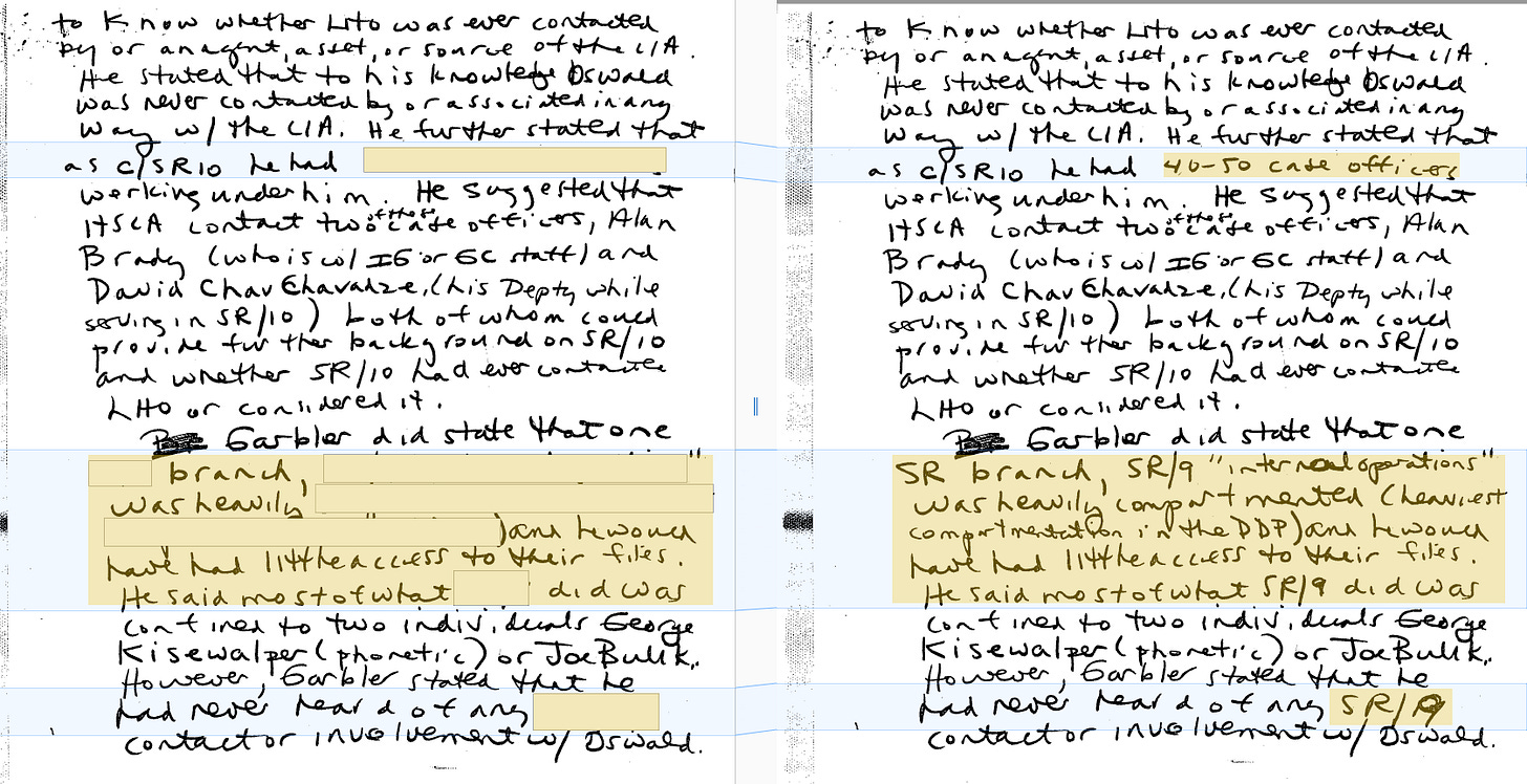 A final noteworthy document in the May 11 Archives release is a short interview with Paul Garbler. He was the first CIA chief of station in Moscow in 1961, a time when Oswald had applied to repatriate to the United States. The information now unsealed discloses the number of people (40 to 50) assigned to the “Legal Travelers” program, a project by which the CIA tried to recruit Russian-speaking students and travelers visiting Russia. The document also unveils the number (SR/9) for the CIA’s “internal operations” Russian branch.