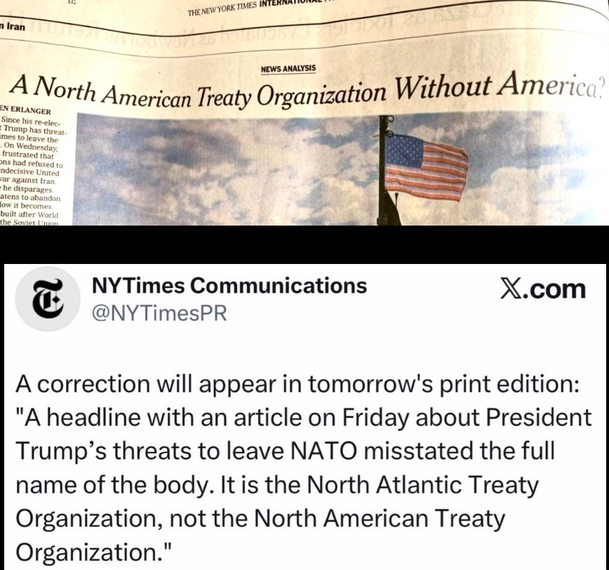 The New York Times has corrected its embarrassing print headline that described NATO as the North AmericanTreaty Organization rather than the North Atlantic Treaty Organization.